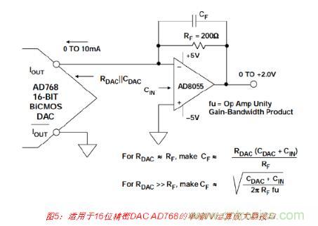 通過(guò)使用單個(gè)運(yùn)算放大器作為I/V轉(zhuǎn)換器,便可輕松執(zhí)行單端電流電壓轉(zhuǎn)換,如圖5所 示。AD768的10 mA滿(mǎn)量程DAC電流輸出可以在200 Ω RF電阻上產(chǎn)生0至+2 V的輸出電 壓。