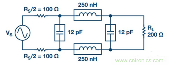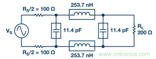 2. 將單端濾波器變?yōu)椴罘譃V波器。源阻抗和負(fù)載阻抗保持不變,所有電容并聯(lián),所有串聯(lián)電感減半并放在另一差分路徑中(參見(jiàn)圖17)。