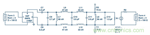 4. 對(duì)于子系統(tǒng)級(jí)仿真,應(yīng)在輸入端增加ADL5201 DGA S參數(shù)文件,并使用壓控電壓源來(lái)模擬濾波器輸出端的 AD6641 ADC。為將低通濾波器變?yōu)閹V波器,增加兩個(gè)分流電感:L7與C9并聯(lián),L8與C11并聯(lián)。C12代表AD6641輸入電容。R3和R4是放在AD6641輸入端的兩個(gè)負(fù)載電阻,用作濾波器的負(fù)載。AD6641輸入為高阻抗。調(diào)諧后的情況參見(jiàn)圖19。
