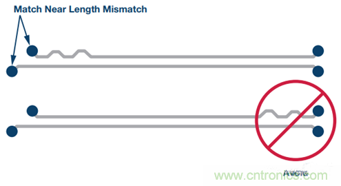 在靠近差分對(duì)內(nèi)偏斜源處引入少量彎彎曲曲的校正,從而降低 這種偏斜(參見(jiàn)圖22)。