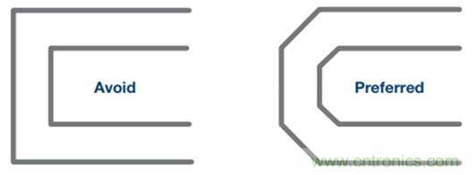 差分對(duì)布線時(shí),應(yīng)避免急轉(zhuǎn)彎(90°)(參見(jiàn)圖23)。