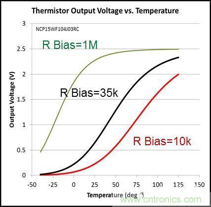 熱敏電阻的缺點(diǎn)是,只有在很窄的溫度范圍內(nèi),它的輸出才是線性和準(zhǔn)確的,而在這個(gè)范圍之外會(huì)變得非線性。圖2繪制了三條熱敏電阻的輸出曲線,偏置電阻分別為1MΩ、35kΩ和10kΩ。在窄溫度范圍內(nèi),每條曲線都是線性的,不過(guò)在偏置電阻分別為1MΩ、35kΩ和10kΩ,而溫度分別為10ºC、75ºC和50ºC以下時(shí),這三條曲線為非線性。雖然針對(duì)特定溫度,可以使用專門校準(zhǔn)的熱敏電阻來(lái)實(shí)現(xiàn)目標(biāo)精度,但是這種熱敏電阻成本較高,并且這三款不同的器件也使得庫(kù)存管理變得過(guò)于復(fù)雜。其它缺點(diǎn)還包括無(wú)法預(yù)計(jì)的故障、抗擾度低和功耗較高。