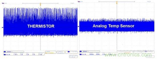 圖6:熱敏電阻與模擬溫度傳感器在連接到開(kāi)關(guān)穩(wěn)壓器時(shí)的噪聲實(shí)驗(yàn)