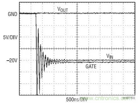 圖 3 示出了當 VIN 帶電插入至 –20V 時出現的狀況。 在連接的前一刻, VIN 、VOUT 和 GATE 以地電位為起始點。由于 VIN 和 GATE 連接線的寄生電感之原 因, VIN 和 GATE 引腳上的電壓將顯著地變至 –20V以下。外部 MOSFET 必須具有一個可安全承受該過沖的擊穿電壓指標。