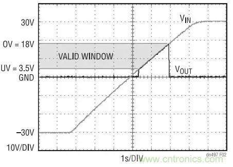 圖 2 示出了圖 1 電路中的 VIN 從 –30V 緩慢斜坡上升 至 30V 時做出的反應。UV 和 OV 門限被分別設定為 3.5V 和 18V。當電源電壓位于 3.5V 至 18V 窗口之內 時, VOUT 跟隨 VIN 。若超出該窗口時,LTC4365 將 關斷 N 溝道 MOSFET,并使 VOUT 與 VIN 斷接,即使 在 VIN 為負值的情況下也不例外。