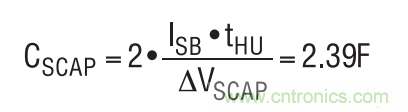 在后備模式中,當(dāng)超級電容器組上的電壓開始接近VOUT 時,在計(jì)算 tHU 結(jié)束時超級電容器上的最小電壓必須將兩個超級電容器的 ESR 和 LDO 的輸出電阻考慮在內(nèi)。假設(shè)每個超級電容器的 ESR 為 100mΩ,而 LDO 輸出電阻為 200mΩ,這將由于 50mA 待機(jī)電流的原因而使VOUT (MIN)增加20mV。VOUT (MIN)設(shè)定為3.1V,從而在超級電容器組上產(chǎn)生一個1.88V的放電電壓 (?VSCAP)?,F(xiàn)在,可以確定每個超級電容器的大小。