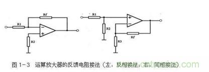 其次,由于放大倍數(shù)為無窮大,所以不能將運算放大器直接用來做放大器用,必須要將輸出的信號反饋到反相輸入端(稱為負反饋)來降低它的放大倍數(shù)。如圖1-3中左圖所示,R1的作用就是將輸出的信號返回到運算放大器的反相輸入端,由于反相輸入端與輸出的電壓是相反的,所以會減小電路的放大倍數(shù),是一個負反饋電路,電阻Rf也叫做負反饋電阻。