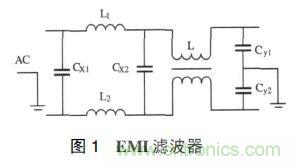 濾波是一種抑制傳導干擾的方法, 在電源輸入端接上濾波器可以抑制來自電網(wǎng)的噪聲對電源本身的侵害, 也可以抑制由開關(guān)電源產(chǎn)生并向電網(wǎng)反饋的干擾。電源濾波器作為抑制電源線傳導干擾的重要單元, 在設(shè)備或系統(tǒng)的電磁兼容設(shè)計中具有極其重要的作用。電源進線端通常采用如圖1 所示的EMI 濾波器電路。該電路可以有效地抑制交流電源輸入端的低頻差模騷擾和高頻段共模騷擾。在電路中, 跨接在電源兩端的差模電容Cx1、Cx2 ( 亦稱X 電容) 用于濾除差模干擾信號, 一般采用陶瓷電容器或聚脂薄膜電容器, 電容值通常取0.1~ 0. 47F。而中間連線接地的共模電容Cy1和Cy2 ( 亦稱Y 電容) 則用來短路共模噪聲電流, 取值范圍通常為C1=C2 # 2 200 pF。抑制電感L1、L2 通常取100~ 130H, 共模扼流圈L 是由兩股等同并且按同方向繞制在一個磁芯上的線圈組成, 通常要求其電感量L#15~ 25 mH。當負載電流渡過共模扼流圈時, 串聯(lián)在火線上的線圈所產(chǎn)生的磁力線和串聯(lián)在零線上線圈所產(chǎn)生的磁力線方向相反, 它們在磁芯中相互抵消。因此, 即使在大負載電流的情況下, 磁芯也不會飽和。而對于共模干擾電流, 兩個線圈產(chǎn)生的磁場是同方向的, 會呈現(xiàn)較大電感, 從而起到衰減共模干擾信號的作用。