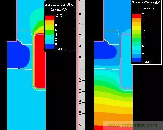 圖4:完全導(dǎo)通(左)和線性區(qū)的電勢分布圖