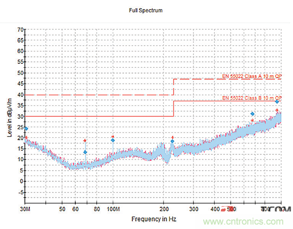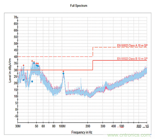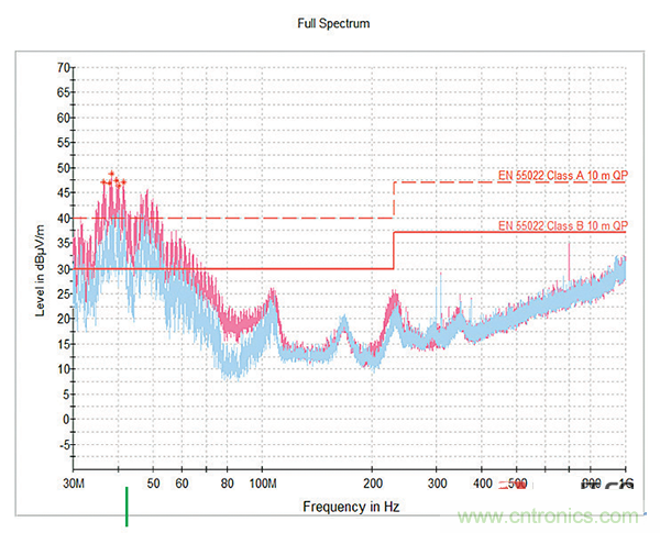 這種濾波器插入設(shè)計提供了最大的屏蔽效能,并使等效串聯(lián)電感最小化,為芯片電容器提供可用的最佳性能,同時還利用了系統(tǒng)中已存在的屏蔽。結(jié)合專用的22000pF濾波器,濾波器插入實現(xiàn)了圖10所示的結(jié)果,從而以具有成本效益的長期解決方案來滿足EMC法規(guī)。