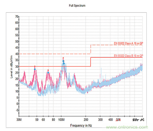 然后,使用22000pF芯片電容濾波器插件進行測試,試圖將最大濾波器性能調(diào)整到噪聲持續(xù)的較低頻率區(qū)域。如圖9所示,性能得到改善,在較低頻率的噪聲極限處或附近只有很小的尖峰。但是這個濾波器導(dǎo)致能量“膨脹”到105MHz附近的更高頻率,超過了允許的極限。