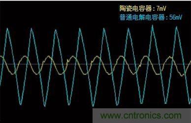 其優(yōu)點主要有兩個。一是能削減貼裝面積。因為片狀多層陶瓷電容器單位體積的靜電容量較大。另一個是用于DC-DC轉換器等輸出平滑電路時,可降低輸出紋波電壓。原因在于片狀多層陶瓷電容器的等效串聯(lián)電阻(ESR:Equivalent Series Resistance)較低。如圖1所示,使用鉭電解電容器時,輸出紋波電壓為56mV,而使用片狀多層陶瓷電容器時則降到了7mV。