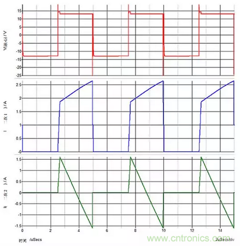 圖3:重載次級(jí)1和輕載次級(jí)2?;妷簩?duì)次級(jí)2的輸出電容器進(jìn)行峰值充電。