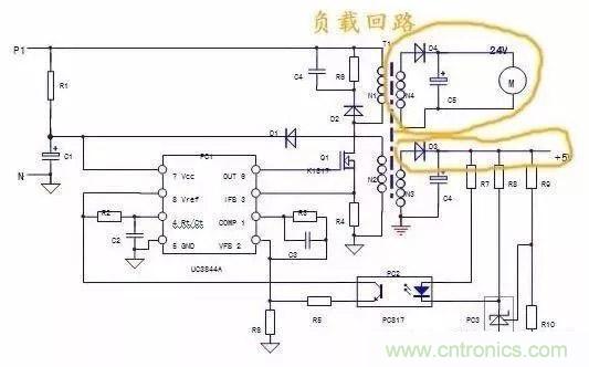 B.對UC3844單獨(dú)上電,短接PC2輸入側(cè),若電路起振,說明故障在PC2輸入側(cè)外圍電路;電路不起振則檢查輸出側(cè)電路。