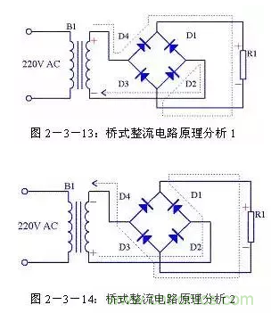 由圖2-3-13可以看出在電源正半周時(shí),B1次級上端為正,下端為負(fù),整流二極管D4和D2導(dǎo)通,電流由變壓器B1次級上端經(jīng)過D4、R1、D2回到變壓器B1次級下端;由圖2-3-14可以看出在電源負(fù)半周時(shí),B1次級下端為正,上端為負(fù),整流二極管D1和D3導(dǎo)通,電流由變壓器B1次級下端經(jīng)過 D1、R1、D3回到變壓器B1次級上端。R1兩端的電壓始終是上正下負(fù),其波形與全波整流時(shí)一致。