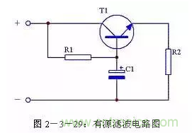 當(dāng)對濾波效果要求較高時(shí),可以通過增加濾波電容的容量來提高濾波效果。但是受電容體積限制,又不可能無限制增大濾波電容的容量,這時(shí)可以使用有源濾波電路。其電路形式見圖2-3-29,其中電阻R1是三極管T1的基極偏流電阻,電容C1是三極管T1的基極濾波電容,電阻R2是負(fù)載。這個(gè)電路實(shí)際上是通過三極管T1的放大作用,將C1的容量放大β倍,即相當(dāng)于接入一個(gè)(β+1)C1的電容進(jìn)行濾波。