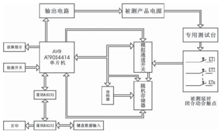 在測(cè)試過(guò)程中,被測(cè)產(chǎn)品的延時(shí)數(shù)據(jù)的檢測(cè)是通過(guò)對(duì)檢測(cè)信號(hào)(用被測(cè)產(chǎn)品的延時(shí)閉合的動(dòng)合觸點(diǎn))來(lái)進(jìn)行監(jiān)測(cè),而被檢測(cè)產(chǎn)品的工作電源又為工作變壓器初級(jí)線圈(一般都為批次檢測(cè))屬電感性負(fù)載。由于對(duì)被檢測(cè)的產(chǎn)品的時(shí)間延時(shí)參數(shù)是與產(chǎn)品工作電源的加入同步進(jìn)行,待被檢測(cè)的產(chǎn)品并對(duì)其延時(shí)參數(shù)數(shù)據(jù)進(jìn)行存儲(chǔ)都完成后,而相應(yīng)的執(zhí)行程序?qū)ζ浔粰z測(cè)產(chǎn)品進(jìn)行逐一檢測(cè)確定后,將被檢測(cè)產(chǎn)品工作電源關(guān)斷且延長(zhǎng)一定時(shí)間后,然后再進(jìn)行下一次延時(shí)檢測(cè)(工作電源重新加入循環(huán)進(jìn)行)到所需檢測(cè)的次數(shù)完成后,對(duì)所存儲(chǔ)的數(shù)據(jù)進(jìn)行處理(將每只產(chǎn)品延時(shí)數(shù)據(jù)進(jìn)行從大到小排列,選出N次數(shù)據(jù)量中的最大值tmax,以及最小值tmin。對(duì)其數(shù)據(jù)進(jìn)行算術(shù)平均值處理 。