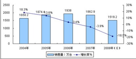 圖1 2003-2008(E)年中國(guó)DVD播放機(jī)銷(xiāo)售量規(guī)模與增長(zhǎng)