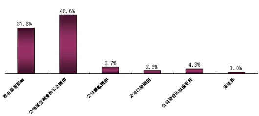 一個(gè)公司能否健康地發(fā)展,領(lǐng)導(dǎo)層的作用至關(guān)重要。常言道,滄海橫流方顯英雄本色,在經(jīng)濟(jì)牛市中,考驗(yàn)的是企業(yè)決策人的遠(yuǎn)見和膽識(shí),在經(jīng)濟(jì)熊市中,就更需要企業(yè)領(lǐng)導(dǎo)層的聰明才智。此次調(diào)查顯示,超過(guò)64.3%的電子工程師給了自己的企業(yè)領(lǐng)導(dǎo)層很正面的評(píng)價(jià),從這個(gè)結(jié)果來(lái)看,我們的電子行業(yè)的工作和諧程度還是較高的!