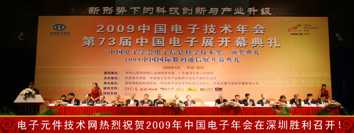 4月9日,“2009年中國電子技術年會”與“第73屆中國電子展暨2009中國國際數(shù)碼通信展”開幕式同時在會展中心隆重召開。本屆年會由工業(yè)和信息化部、深圳市人民政府指導,中國電子學會、中國電子信息產(chǎn)業(yè)集團中國電子器材總公司主辦,電子元件技術網(wǎng)(www.hubali.cn)是活動特別支持網(wǎng)站,年會以“新形勢下的科技創(chuàng)新與產(chǎn)業(yè)升級”為主題。原信息產(chǎn)業(yè)部部長、中國電子學會理事長吳基傳,工業(yè)和信息化部副部長婁勤儉,工業(yè)和信息化部有關司局領導,深圳市、中國電子信息產(chǎn)業(yè)集團公司有關領導及多位院士、專家出席了會議。