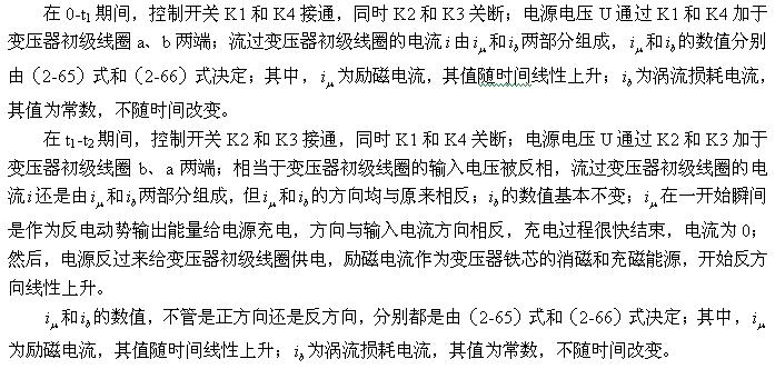 根據(jù)前面分析,磁滯損耗主要由勵(lì)磁電流 產(chǎn)生的,但雙激式開關(guān)變壓器初級(jí)線圈中的勵(lì)磁電流與單激式開關(guān)變壓器初級(jí)線圈中的勵(lì)磁電流產(chǎn)生的作用并不完全相同。單激式開關(guān)變壓器初級(jí)線圈中的勵(lì)磁電流產(chǎn)生磁場(chǎng)對(duì)變壓器貼芯進(jìn)行充磁和退磁外,其存儲(chǔ)的能量只能用來(lái)作為反激式輸出給負(fù)載,因?yàn)樽儔浩鞒跫?jí)線圈輸入的電壓是單極性脈沖,變壓器初級(jí)線圈無(wú)法換相。