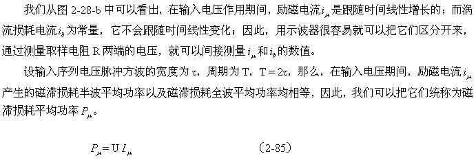 這里順便指出,利用(2-88)和(2-89)式來(lái)分別測(cè)試變壓器鐵心的磁滯損耗和渦流損耗是非常困難的;一個(gè)是它們的系數(shù)很難決定,另一個(gè)是兩者很難分別進(jìn)行測(cè)量,或從測(cè)量結(jié)果中進(jìn)行分離。對(duì)比兩式的參數(shù)就可以知道,它們之間最大的區(qū)別是頻率對(duì)損耗的影響程度;一個(gè)是與頻率成正比,另一個(gè)是與頻率的平方成正比。
