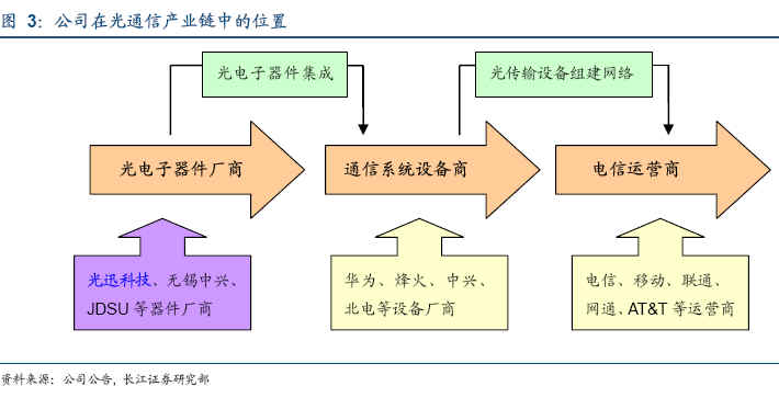 全球光通信行業(yè)長(zhǎng)期向好--公司增長(zhǎng)的基礎(chǔ)如圖3所示,光迅科技處于光通信產(chǎn)業(yè)鏈的上游位置,故公司的增長(zhǎng)前景,取決于光通信行業(yè)的未來(lái)趨勢(shì)。