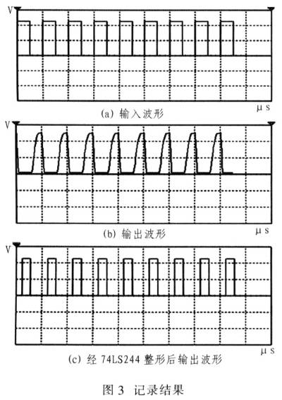 調(diào)試中,輸入周期為100μs,占空比為1/2的+5V方波,對一路光耦的輸入端波形和經(jīng)過20m長線后接收光耦的輸出端波形以及經(jīng)過74LS244整形后的波形進(jìn)行記錄。記錄結(jié)果如圖3所示。