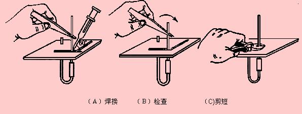 (1)將電阻插入印刷電路板小孔。從正面插入(不帶銅箔面)。電阻引腳留3~5毫米。