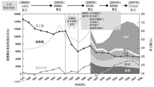 在這一巨大的轉(zhuǎn)變過(guò)程中,TI公司的營(yíng)收也發(fā)生著變化。雖然1995年后營(yíng)收出現(xiàn)縮減,但隨著DSP/模擬業(yè)務(wù)規(guī)模的不斷擴(kuò)大,到2006~2007年,公司的營(yíng)收便超過(guò)了變革以前的水平。尤其值得特別一提的是,公司員逐年減少,員工人均營(yíng)業(yè)利潤(rùn)的增長(zhǎng)卻異常迅速,從1989年的人均4300美元、1995年的2。68萬(wàn)美元,增長(zhǎng)到了2007年的11。59萬(wàn)美元,在l8年間增長(zhǎng)了27倍,1995年~2007年的12年間也增長(zhǎng)了4倍多。而且,公司在半導(dǎo)體業(yè)的排名也從1995年的第7位提升到了近年很穩(wěn)定的3~4位。