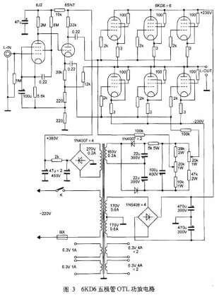 對(duì)于普通功率電子管改成三極管接法的OTL功放來(lái)說(shuō),并不是所有功率管均能采用,必須選用屏極電壓范圍較大的束射四極管或五極功率電子管,如6KD6、6L6、6P3P、6146等。同時(shí),功放級(jí)還必須采用多只功率管并聯(lián)的方式,在8Ω低阻抗負(fù)載時(shí),每聲道采用6只功率管并聯(lián)才能符合低阻抗負(fù)載的要求,并且輸出功率僅為30W左右。
