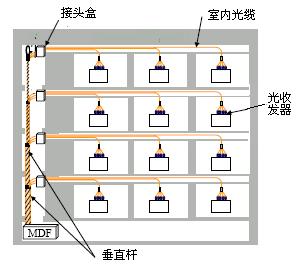 總配線架(MDF)安裝在大樓內(nèi)的公共地區(qū),光纜通過(guò)垂直的桿狀物通向各樓層,再通過(guò)水平方向上的管道進(jìn)入房間。