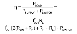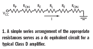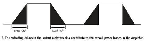 有兩個(gè)晶體管“開(kāi)”的典型的D類放大器的直流等效電路只是一連串的串聯(lián)電阻:RON,每個(gè)晶體管的輸出傳導(dǎo)損耗;RP,金屬互連線,引線結(jié)構(gòu)和PC板走線的附加電阻;PL,負(fù)載電阻(圖1)。另一個(gè)產(chǎn)生功耗的是輸出電阻中的開(kāi)關(guān)延遲(圖2)。整個(gè)系統(tǒng)的效率使可以估算如下:
