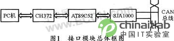本文所介紹的USB-CAN轉(zhuǎn)接技術(shù)總體框圖如圖1所示,該設(shè)計分兩大部分:一是與主機USB接口相連的USB控制部分;二是與CAN總線相連的CAN控制器部分。兩者中間通過單片機聯(lián)系起來。USB控制部分用USB接口控制芯片CH372來實現(xiàn)數(shù)據(jù)的接收和發(fā)送;CAN控制器SJA1000用來實現(xiàn)CAN總線間的數(shù)據(jù)通信。單片機用來進(jìn)行相應(yīng)的控制、協(xié)調(diào)以及系統(tǒng)的通信。
