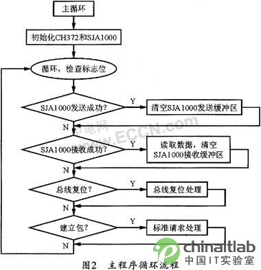 單片機AT89C52在系統(tǒng)中主要起到一個橋梁和協(xié)調(diào)控制的作用。主機通過CH372把數(shù)據(jù)發(fā)送到單片機,單片機再把數(shù)據(jù)通過SJA1000發(fā)送到CAN總線,從而實現(xiàn)整個系統(tǒng)的通信。此外,單片機還需要對CH372和SJA1000進(jìn)行初始化,并通過地址/數(shù)據(jù)以復(fù)用的方式訪問CH372和SJA1000。由于在訪問其中一個芯片時,如果另一個芯片還保持有輸出,那么單片機就不能讀到正確的數(shù)據(jù),因此,單片機要通過片選控制信號分配有效地址。單片機主要通過主循環(huán)來監(jiān)控系統(tǒng)的通信,其主循環(huán)流程圖見圖2所示。[page]