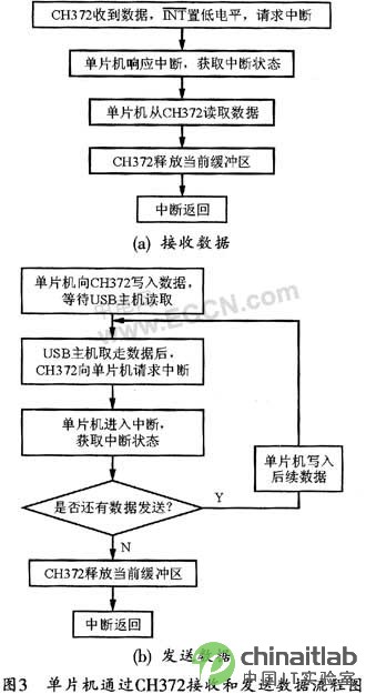 CH372芯片專門用于處理USB通訊。在接收到數(shù)據(jù)或發(fā)送完數(shù)據(jù)后,CH372將以中斷方式通知單片機進(jìn)行處理。單片機通過CH372接收和發(fā)送數(shù)據(jù)的流程圖如圖3所示。