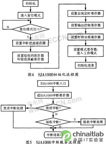 在CAN總線端,單片機控制著傳輸流程。SJA1000的初始化由單片機完成,其初始化流程圖見圖4所示,在正常工作模式下,單片機可控制SJA1000的收發(fā)等操作,以完成和CAN總線的通信。當(dāng)主機端傳來數(shù)據(jù)時,單片機將數(shù)據(jù)轉(zhuǎn)發(fā)到SJA1000的發(fā)送緩沖區(qū),并由SJA1000根據(jù)CAN協(xié)議自動封裝后發(fā)送到CAN總線上;當(dāng)SJA1000接收到來自CAN總線上的一個有效的報文后,系統(tǒng)將在INT引腳上產(chǎn)生一個硬件中斷信號(低有效),當(dāng)單片機收到中斷信號后,即進(jìn)人中斷服務(wù)程序,以完成數(shù)據(jù)的接收和處理,其中斷服務(wù)流程見圖5所示。