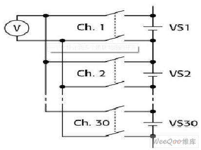 圖1給出了切換伏特計到多個串聯的30電壓源(VS)的情形。為了避免其中一個或多個發(fā)生短路,必須在關閉一個通道之前打開另一個通道(操作前斷開)。此外,要給每個電壓源串聯熔絲,避免超過卡的共模額定電壓。在這個例子中,每個電源都是12V,整個串聯電源的總電壓為360V。最好采用至少500V的通道-通道額定電壓和共模額定電壓。