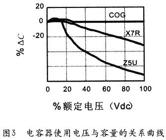 ①電容器的使用電壓對電容器的電容量有影響,穩(wěn)定性低的介質(zhì),在施加額定工作電壓后容量會大幅度下降(見圖3),以至達(dá)不到使用效果,這一點在選擇電容器時必須給以充分注意(不能一味追求大容量和小體積,必須在容量和使用電壓上留有充分余地)。
