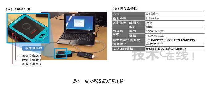 公開了使用索尼“Walkman”和蘋果“iPod nano”的試制機(a)。可將最大120Mbit/秒的數(shù)據(jù)與電力一起進(jìn)行傳輸(b)。[page]