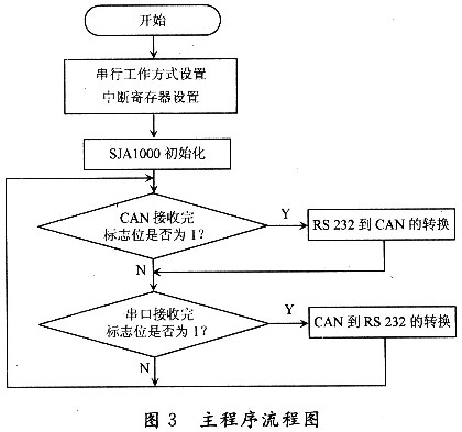在微處理控制下,RS232和CAN進行數據交換時,采用串口接收和CAN中斷方式可提高工作效率。SJAl000的初始化在復位模式下才可以進行,主要包括工作方式的設置、時鐘分頻和驗收濾波寄存器的設置、波特率參數的設置以及中斷允許寄存器的設置等。其主程序流程圖如圖3所示。