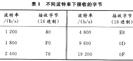 檢測轉換裝置的串口波特率,首先可對主機的接收波特率(以9600b/s為例)進行設定,并在終端發(fā)送一個特定的字符(以回車符為例),這樣,主機根據接收到的字符信息就可以確定轉換裝置的通信波特率?;剀嚪腁SCII值是0DH,在不同波特率下接收到的值如表1所列。[page]
