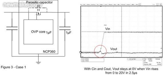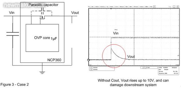 在圖3的案例2中,輸出電容已被移除。這樣,當OVP器件輸入端出現(xiàn)快速輸入瞬態(tài)現(xiàn)象時,旁路元件將保持開路。這時可以在輸出端觀察到過沖,這個過沖可能會損壞連接至OVP輸出端的電子元器件。為了解決這個問題,必須在輸出引腳上連接一個輸出電容,并盡量靠近OVP 器件擺放。