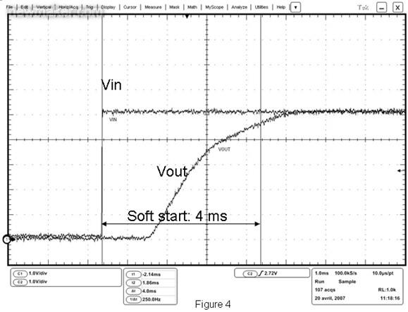 即便出現(xiàn)Vusb或墻適配器快速輸出上升(熱插),在器件的Vout端也觀察不到電壓尖峰,這得益于4ms的軟啟動控制。這種保護的最關(guān)鍵特性是能以最快速度檢測到任何過壓情況,然后將內(nèi)部FET開路。