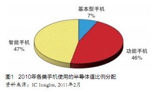 平均算來,現(xiàn)今一部手機(jī)使用的半導(dǎo)體價值約30美元,世界全部手機(jī)使用的半導(dǎo)體總值約占半導(dǎo)體市場近20%,是僅次于PC和消費(fèi)電子的第三大應(yīng)用產(chǎn)品,足見其影響力。智能手機(jī)的半導(dǎo)體含量更大,它裝備更加優(yōu)良的處理器,更多的DRAM和NAND。據(jù)稱,它與基本手機(jī)半導(dǎo)體含量之比約為9:1,其對半導(dǎo)體業(yè)的重要性更可見一斑。市場調(diào)研公司IC Isights報告指出,2010年世界手機(jī)使用半導(dǎo)體產(chǎn)品共425億美元,其中智能手機(jī)(Smartphone)200億美元,占47%,首次超過增強(qiáng)型手機(jī)(Enhanced),基本型手機(jī)(Basic)用半導(dǎo)體僅30億美元,占7%(見圖1)。預(yù)計2014年手機(jī)使用半導(dǎo)體將增至555億美元,年均增長率7.5%,智能手機(jī)使用半導(dǎo)體則將以每年20%的速度迅猛成長,屆時將達(dá)416億美元,獨(dú)占手機(jī)用半導(dǎo)體的75%,相反基本型手機(jī)屆時將進(jìn)一步縮減至僅為16億美元,只及2010年的一半。
