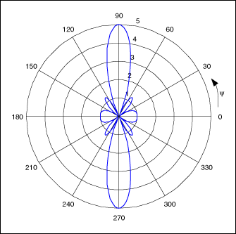 圖2.五單元天線矩陣(單元間相差為零)產(chǎn)生的輻射圖,天線位于原點(diǎn),沿x軸以半波長(zhǎng)為間距。[page]