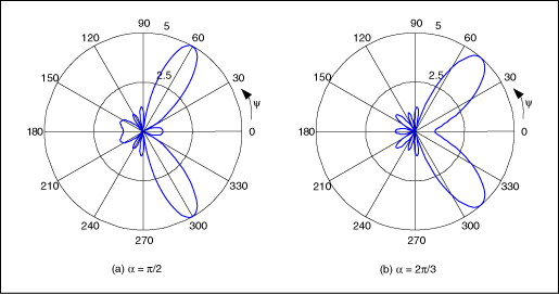 除了改變波瓣的寬度,通過(guò)對(duì)連續(xù)單個(gè)天線的信號(hào)設(shè)定固定的相位延遲α(圖3),還可以實(shí)現(xiàn)主波瓣在x–y平面內(nèi)的旋轉(zhuǎn)。天線陣列的輻射圖正比于天線陣列系數(shù)F(u):