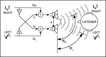 當(dāng)兩個(gè)揚(yáng)聲器的間距逐漸縮小時(shí),這種時(shí)延逐漸縮小,直到最后兩個(gè)揚(yáng)聲器聽(tīng)起來(lái)如同一個(gè)揚(yáng)聲器的效果。這種串?dāng)_會(huì)使人腦“意識(shí)”到兩個(gè)音源距離非常近。為了從緊湊的音源間距獲得相隔較遠(yuǎn)的音源效果,必須消除耳間串?dāng)_。在每個(gè)揚(yáng)聲器中加入抵消另一個(gè)揚(yáng)聲器聲音的信號(hào),在音源前端消除聽(tīng)覺(jué)串?dāng)_。這種串?dāng)_的消除使聽(tīng)者感覺(jué)聲音發(fā)自相隔較遠(yuǎn)的音源信號(hào)3。