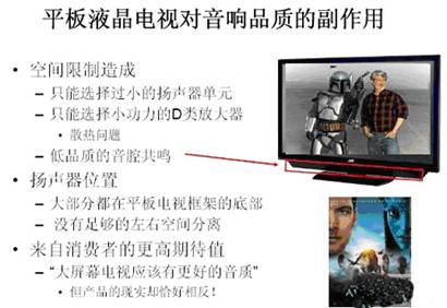 他指出要設(shè)計好的電視音響則需要有好的揚聲器單元、大的電視機空間(便于散熱)、更好的揚聲器空間分離(實現(xiàn)雙聲道立體聲效果)、對低頻補償,但是看看現(xiàn)在平板電視,基本是否定了這些要素:例如LCD-TV在采用LED背光后變的更薄、很多液晶電視的音箱放置于電視底端造成空間分離不明顯、由于電視變薄散熱問題加劇廠商把音頻輸出功率降低,所有這一切造成了了一個后果:電視機屏幕越大聽覺體驗越差!