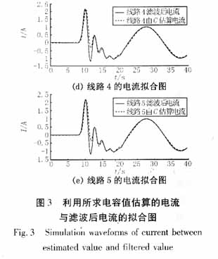 由此可得:C2+C3+C4+C5=0.75462μF,可見(jiàn)其數(shù)值上與C∑相等。并且,由系統(tǒng)參數(shù)ωC0=4.175μS/km可推出C0=4.175/314=0.013296μF,則由Ci=C0*li可得:C2=0.39888μF,C3=0.07978μF,C4=0.13296μF,C5=0.13296μF,可見(jiàn),這些值和利用本方法估計(jì)出的各線路對(duì)地電容值差甚微。